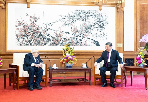 习近平指出,基辛格博士刚刚度过百岁生日,你访问中国已经一百多次。这两个“一百”加在一起,使你这次访华具有特殊意义。52年前,中美两国处在一个关键转折点,毛泽东主席、周恩来总理同尼克松总统和你本人以卓越的战略眼光,作出中美合作的正确抉择,开启了中美关系正常化进程,既造福了两国,也改变了世界。中国人重情讲义,我们不会忘记老朋友,不会忘记你为推动中美关系发展、增进中美两国人民友谊作出的历史性贡献。