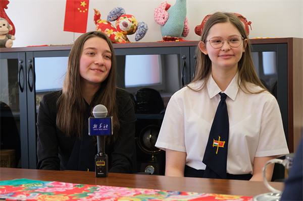 2月7日,在匈牙利首都布达佩斯,匈中双语学校学生胡灵月(左)和宋智孝接受新华社记者采访。新华社记者 邓耀敏 摄