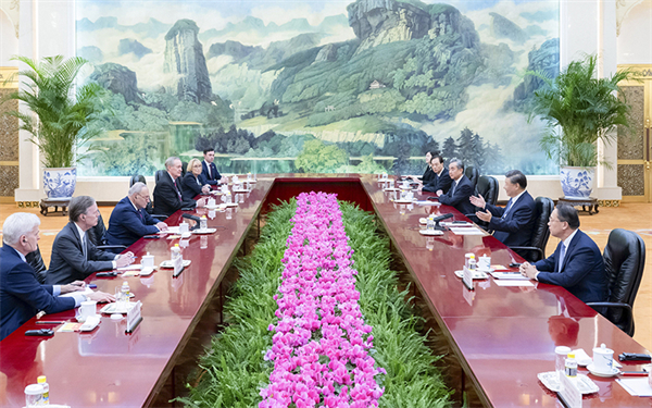 109日下午,国家主席习近平在北京人民大会堂会见美国国会参议院多数党领袖舒默率领的美国国会参议院两党代表团。新华社记者 翟健岚 摄