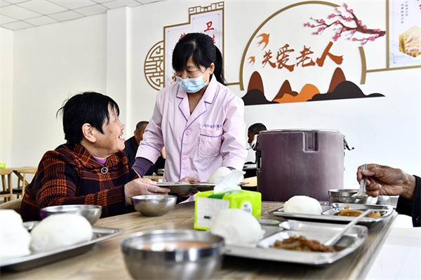 在山东省东营市垦利区杨庙社区养老服务中心,工作人员为老人盛午餐(2021年10月18日摄)。新华社记者 郭绪雷 摄