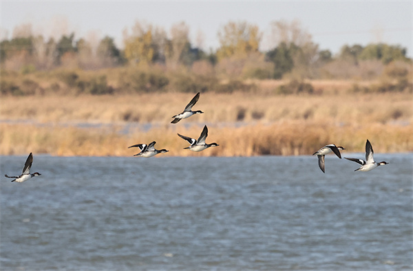 2023年11月12日,在黄河三角洲国家级自然保护区,越冬候鸟在飞翔。新华社记者 徐速绘 摄