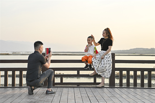 2023年5月16日,市民在山西运城盐湖拍照。新华社记者 杨晨光 摄
