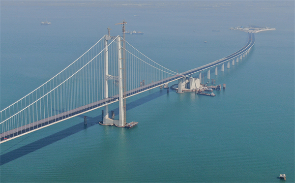 2023年11月28日,粤港澳大湾区超级工程深中通道主线正式贯通,这是深中通道伶仃洋大桥东塔及西人工岛(无人机照片)。新华社记者 邓华 摄