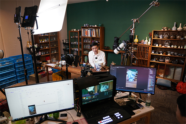 在江西景德镇陶溪川文创街区的直播基地里,工作人员通过网络直播推介陶瓷产品(2023年2月22日摄)。新华社记者 周密 摄