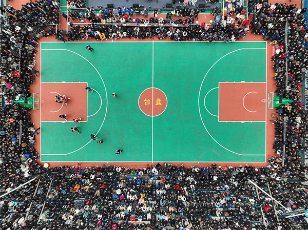 这是2023年3月27日在贵州省黔东南州台江县台盘村拍摄的贵州省首届“美丽乡村”篮球联赛总决赛比赛现场(无人机照片)。新华社记者 欧东衢 摄