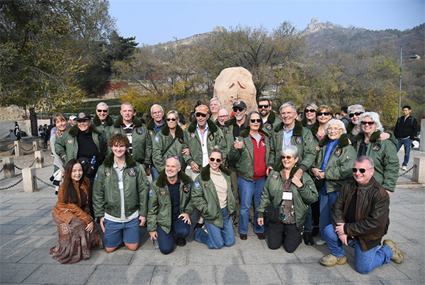 2023年10月29日,飞虎队老兵莫耶一行人在北京八达岭长城合影留念。当日,美中航空遗产基金会访华代表团成员陆续抵达北京。新华社记者 任超 摄