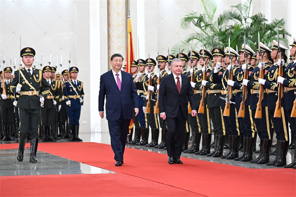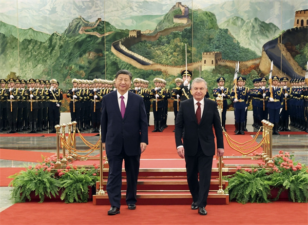天安门广场鸣放21响礼炮,礼兵列队致敬。两国元首登上检阅台,军乐团奏中乌两国国歌。米尔济约耶夫在习近平陪同下检阅中国人民解放军仪仗队,并观看分列式。