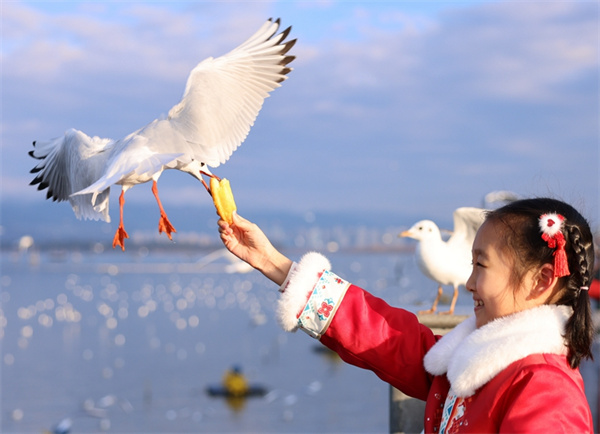 游客在昆明滇池边投喂红嘴鸥(2024年1月17日摄)。新华社发(刘元嵩 摄)