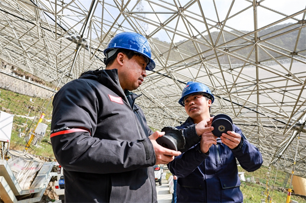2023年2月13日,姜鹏(左)在贵州“中国天眼”的反射面板下与工作人员交谈(维护保养期间拍摄)。新华社记者 欧东衢 摄