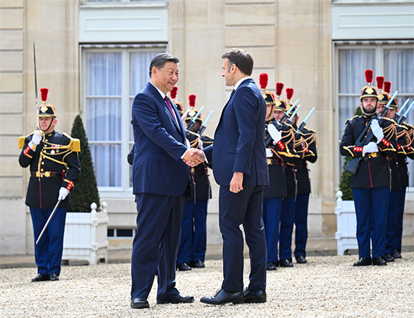 当地时间5月6日上午,国家主席习近平应邀在巴黎爱丽舍宫同法国总统马克龙、欧盟委员会主席冯德莱恩举行中法欧领导人三方会晤。这是习近平同马克龙握手。新华社记者 殷博古 摄