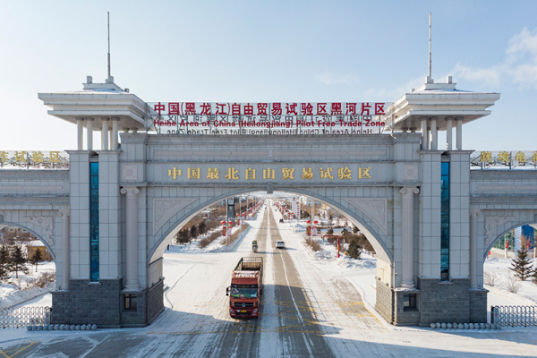 车辆驶出中国(黑龙江)自由贸易试验区黑河片区大门(2023年2月11日摄,无人机照片)。新华社记者 谢剑飞 摄