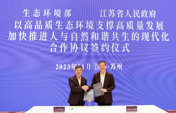 11月1日,生态环境部与江苏省人民政府在江苏苏州签署《以高品质生态环境支撑高质量发展 加快推进人与自然和谐共生的现代化》合作协议。生态环境部部长黄润秋,江苏省委副书记、省长许昆林出席签约仪式并讲话。