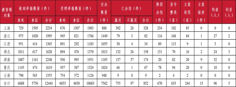 截至5月20日晚20:00,各督察组共收到群众来电、来信举报12444件,受理有效举报10683件,经梳理合并重复举报,累计向被督察地方转办7562件;被督察地方已办结或阶段办结1522件,其中立案处罚244家;立案侦查13件;约谈党政领导干部96人,问责党政领导干部5人。