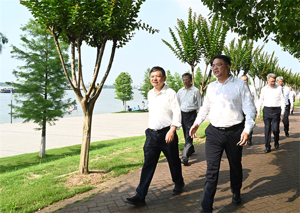 位于武汉市蔡甸区的中法武汉生态示范城,是中法两国合作探索生态环保、产城融合的新型城镇化模式、推动城市可持续发展的先行试点区。黄润秋来到中法生态示范城,调研滨湖生态涵养带规划建设情况,以及绿色低碳智慧产业园区建设情况。他指出,绿色发展是高质量发展的底色,新质生产力本身就是绿色生产力。要牢固树立和践行绿水青山就是金山银山理念,统筹生态保护、生态安全和生态景观,以科技创新推动生产生活方式绿色转型,着力推进生态优先、节约集约、绿色低碳发展,不断提升高质量发展的“含绿量”,建设生态宜居的美丽城市。