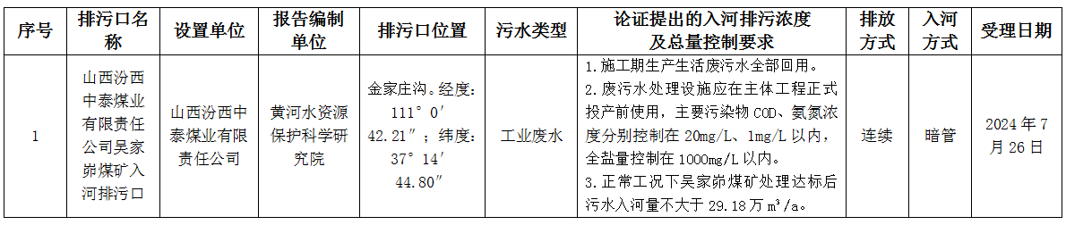 根据相关法律法规要求及入河排污口设置管理有关规定,2024年7月26日,网赌平台受理山西汾西中泰煤业有限责任公司入河排污口的设置申请。
