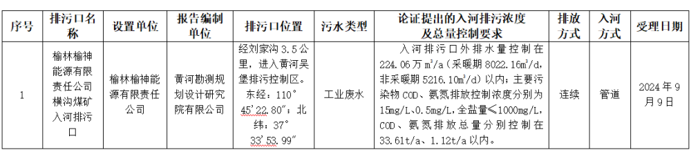 日,我局受理榆林榆神能源有限责任公司横沟煤矿入河排污口的设置申请。
